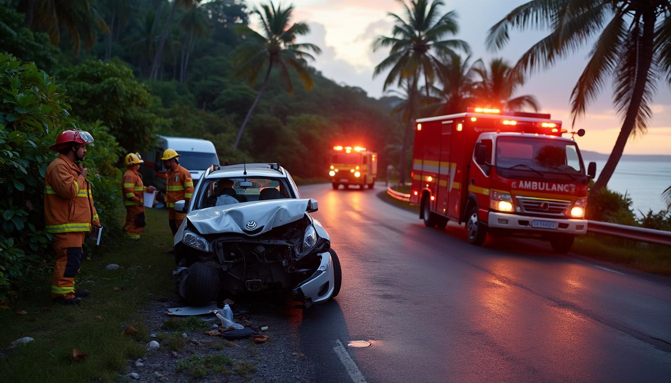 L’accident s’est déroulé dans la nuit du dimanche 3 août 2025, vers 4h05, dans le secteur appelé Les Balisiers, situé au cœur de Capesterre de Marie-Galante. Ce lieu, bien qu’isolé et boisé, supporte un trafic régulier de deux-roues et automobiles, notamment en cette période où la vie nocturne locale est active. La collision a impliqué un scooter, une voiture légère, et un autre scooter, amplifiant la gravité de l’impact.